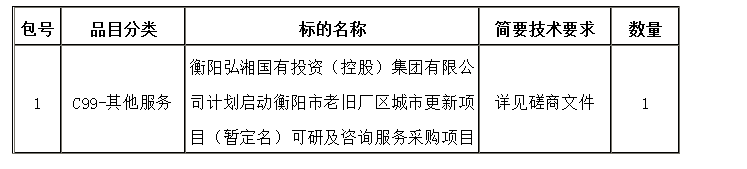 采購項目名稱:衡陽弘湘國有投資(控股)集團有限公司計劃啟動衡陽市老舊廠區(qū)城市更新項目(暫定名)可研及咨詢服務采購項目