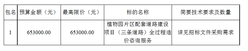 內(nèi)容:負責(zé)完成植物園片區(qū)配套道路建設(shè)項目(三條道路)全過程造價咨詢服務(wù)工作,具體服務(wù)內(nèi)容見招標文件采購需求。