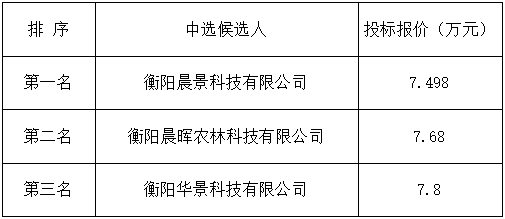 衡陽市2023年度十六、十七批次建設(shè)用地項(xiàng)目采伐作業(yè)設(shè)計(jì)服務(wù)單位比選于2023年7月18日上午9時00分(北京時間)進(jìn)行了比選開標(biāo)、評標(biāo)活動,評標(biāo)委員會按照比選文件規(guī)定的評標(biāo)辦法及原則進(jìn)行評定,推薦中選候選人排名如下: